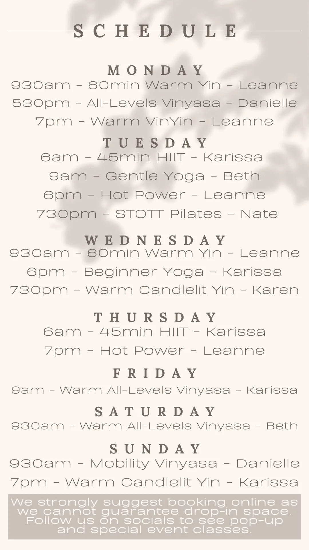 Please note that this schedule is subject to change; classes must have a 5 person minimum to go ahead. 3 hours notice is required for cancellations and this MUST be done online through Momence.com or your app. No-Shows will be charged a drop-in rate (monthly members) or debited a class from your punchcard.